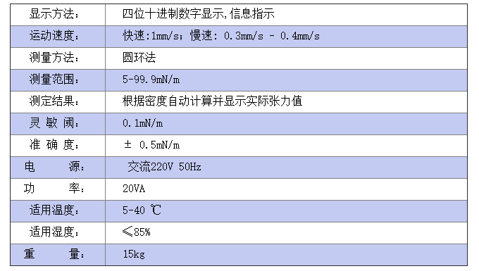 儀器符合GB/T6541的標(biāo)準(zhǔn),采用圓環(huán)法在非平衡的條件下測(cè)量各種液體表面張力(液—?dú)庀嘟缑妫┘暗V物油與水的界面張力(液—液相界面)。該儀器采用了微處理技術(shù),自動(dòng)化程度高、操作簡(jiǎn)便、工作可靠。被測(cè)樣品注入杯后,只要按動(dòng)啟動(dòng)鍵,儀器便可自動(dòng)完成對(duì)試樣的測(cè)量,并能自動(dòng)根據(jù)輸入的具體參數(shù)計(jì)算出被測(cè)試樣的張力值。